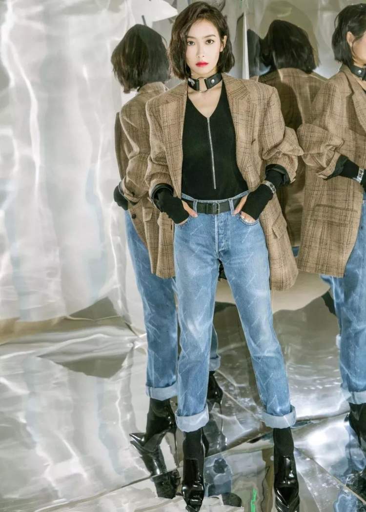宋茜也用了“格纹西装+牛仔裤”这组CP,可以说是非常性感了,脖子上的choker和迷人锁骨透露着一丝野性,oversized的格纹西装时髦又复古。