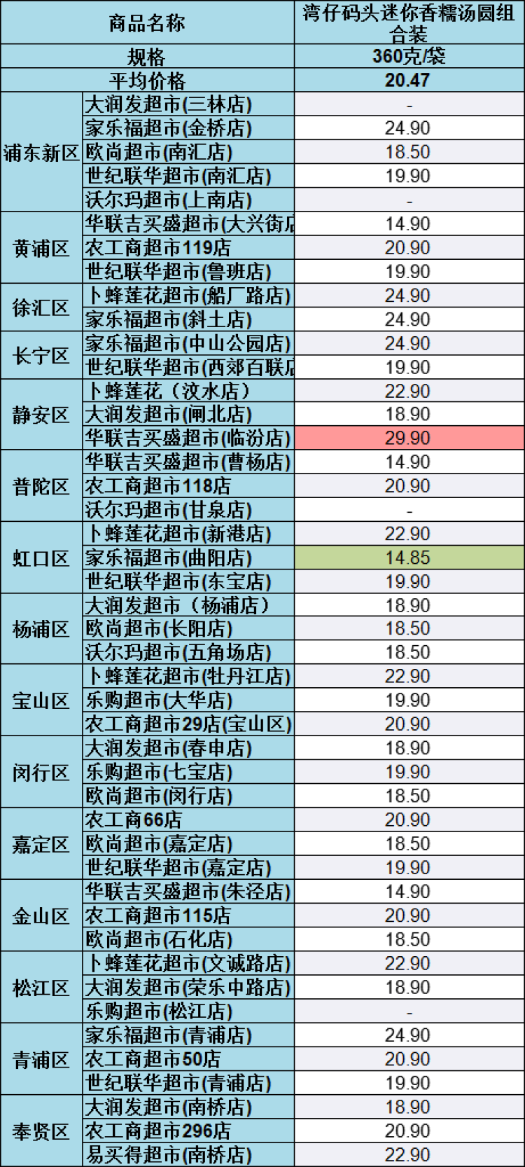 湾仔码头鲜肉汤圆(538克/袋),在欧尚超市石化店售价为30元,在欧尚超市闵行店售价为15.9元,差价达14.1元。