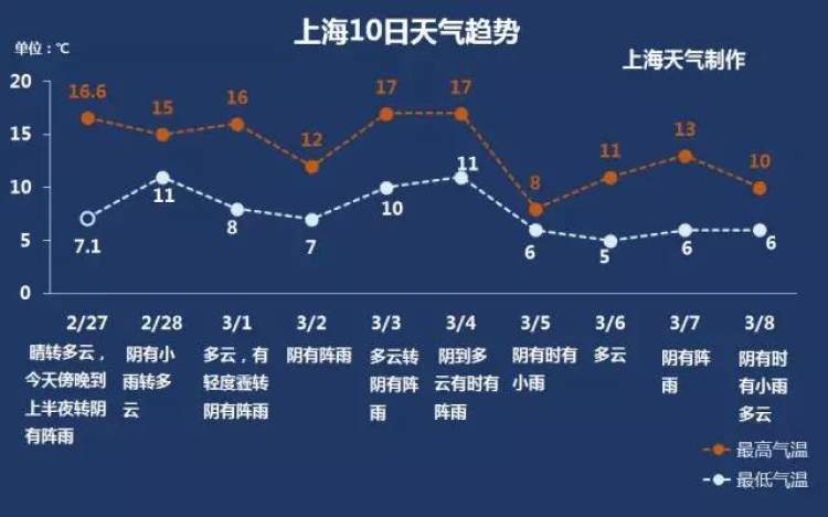 28日到3月1日最高气温呈继续回暖的趋势,预计在16℃,最低气温回暖到8-11℃。3月2日受雨水的打压,最高气温下降到12℃。周末再次迎来回暖,最高可达17℃,最低10℃。下周初还有次较明显的降温。