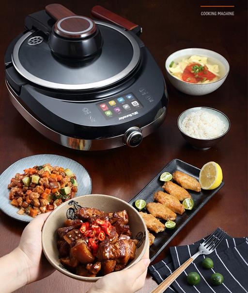 ①九阳J6/J7炒菜机:内置108道菜,可焖、烧、炒、煲、补炊、蒸米饭、自动翻炒。加热方式是日本电饭煲常见的IH加热技术,通过磁力线穿透锅体进行加热。价格1999元。