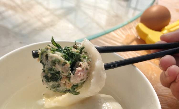 值得一提的是,汤团煮好后,馅料里面的马兰头也是青葱鲜嫩的样子。这就归功于馅料制作过程中的一个小步骤——焯水后的马兰头要放在冷水中过一下。