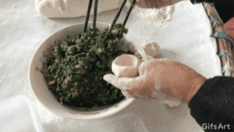 最后,把剁碎的精肉加入素菜部分搅拌均匀,新鲜的馅料就此准备完毕啦。