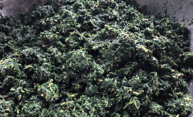 把新鲜的马兰头洗净、焯水、挤净水分、搅碎,和搅碎的香菇搅拌均匀,再加上一点猪油。馅料的素菜部分制作完成!