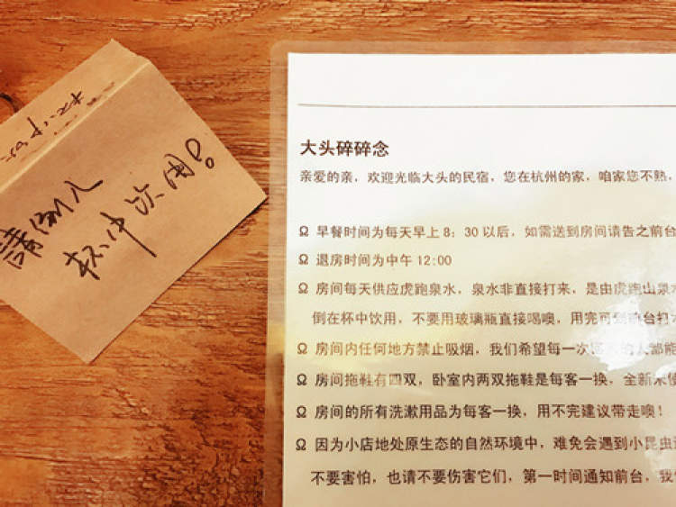 “杭州之行出发前,无意间发现了民宿,觉得这个有风景有特色的民宿才配得上这座柔美雅致的城市。它符合我所有的期待:轻美式的装修风格简约大方,缓坡上的院落可以看到不远处的五云山。窗外小阳台上偶遇了小松鼠,清晨在鸟鸣中睡醒,房间虽不大但旅行中需要的用品主人都已备好。女主人热情、开朗、大方,热情地介绍线路,爬山前给我们备好登山杖,小宝不适熬制了小米粥体贴入微;男主人斯文带有艺术范儿,帮我们运送行李至车上。两人收养了一只有残疾的狗和两只猫,房间的名字是以这一家五口而命名。这个特别、有故事、有爱心的客栈叫“那天以后”。我从未对任何客栈留恋过,但对这里还未离开已有所惦念。”