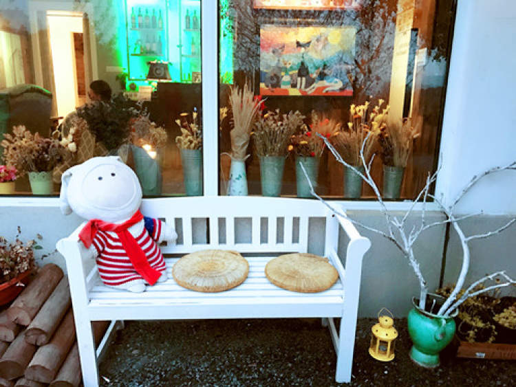 在一个有着摇椅、太阳伞、花草的小巧而温馨的院子后,有一栋白色与天蓝色相间的房子,仿佛一艘停泊的帆船,既是旅人暂歇的港湾,也是主人心灵的家园。