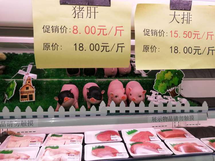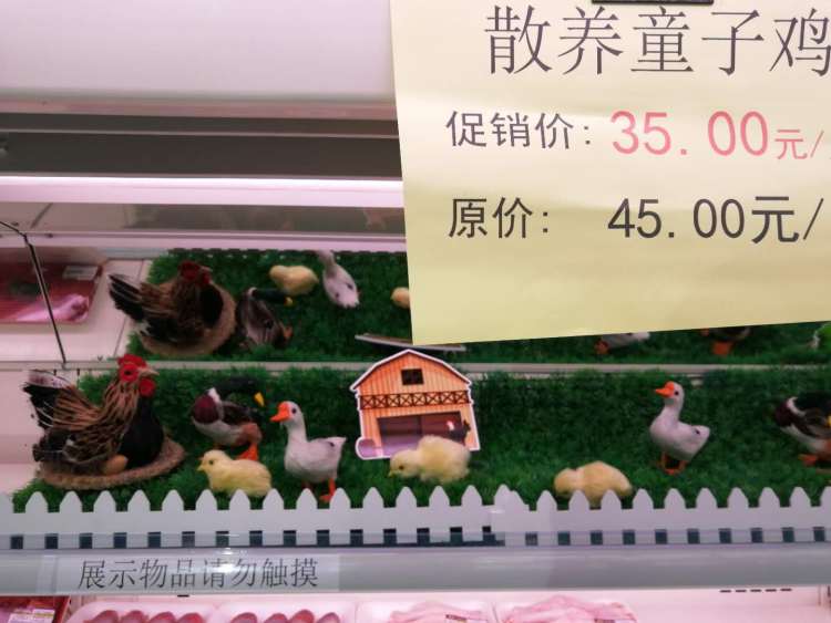 猪肉猪杂的冷柜上,放了几只憨态可掬的小猪,禽肉冷柜上则摆着毛茸茸的小鸡和鹅……为自己的肉和下水做代言,店家,你很皮啊。