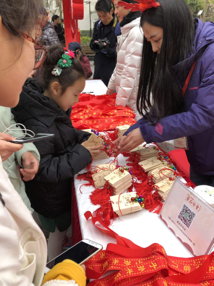 扫一下二维码就可以免费领取一根写有新年愿望的红丝带,把他挂在心形的铁架上,据说新年愿望就会实现。当然,那个小木板挂件不是免费的,10元一个。