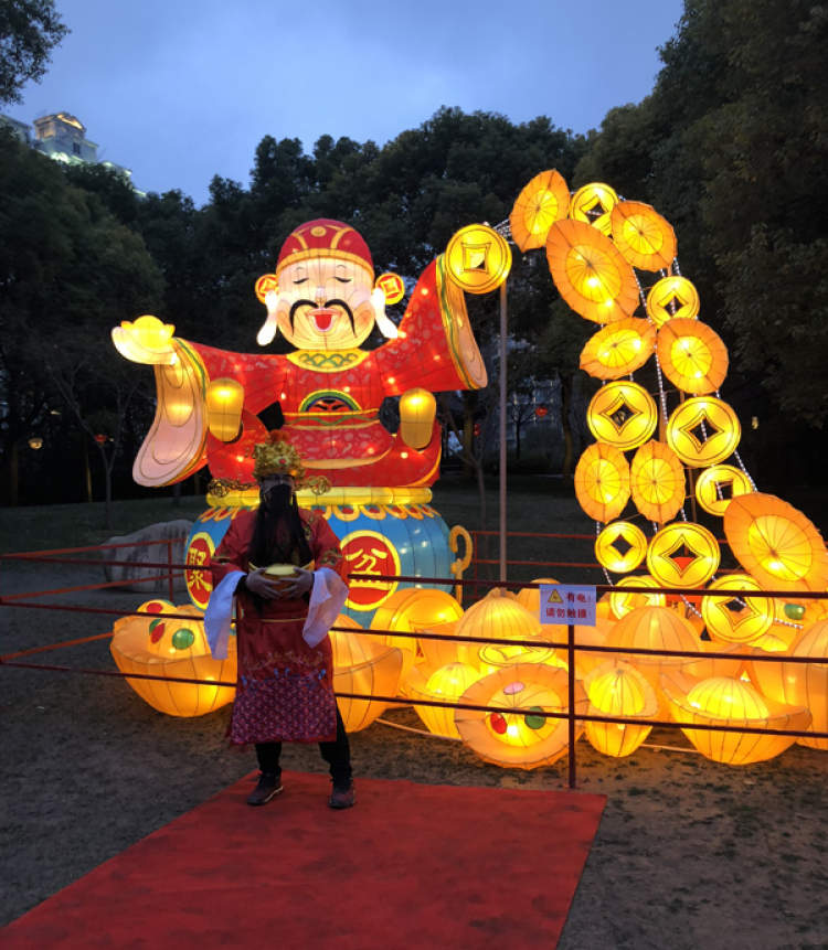 白天的财神,亮灯后的财神爷,化为“肉身”站到了游客中间,满足大家合影的愿望