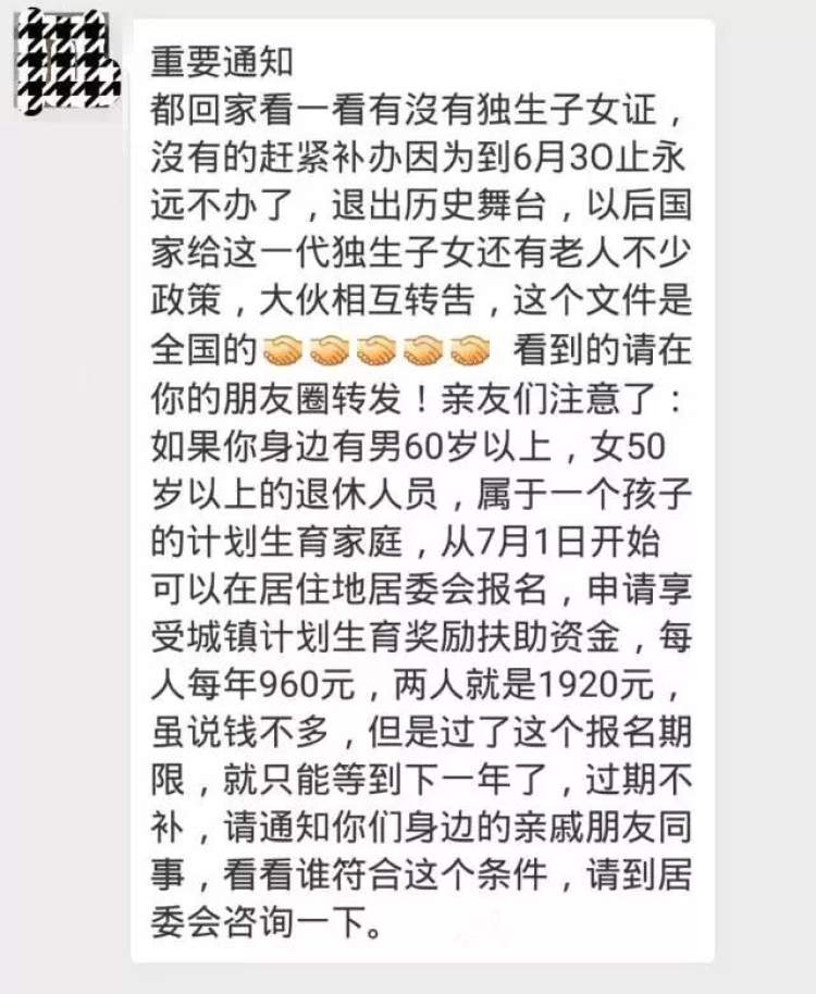 工作人员:请勿相信这条消息,纯属谣言!上海关于独生子女家庭的各项政策中,并没有这一条。