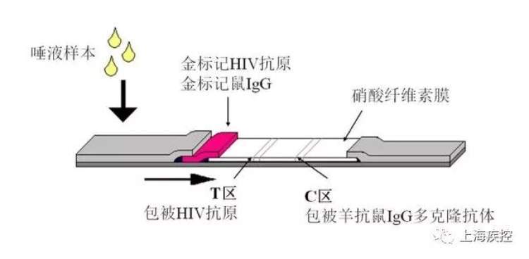 它利用免疫层析的原理,采用双抗原夹心法检测HIV1/2抗体。测试区T区包被HIV抗原,质控区C区包被抗鼠IgG多克隆抗体,胶体金标记HIV抗原和鼠IgG抗原。