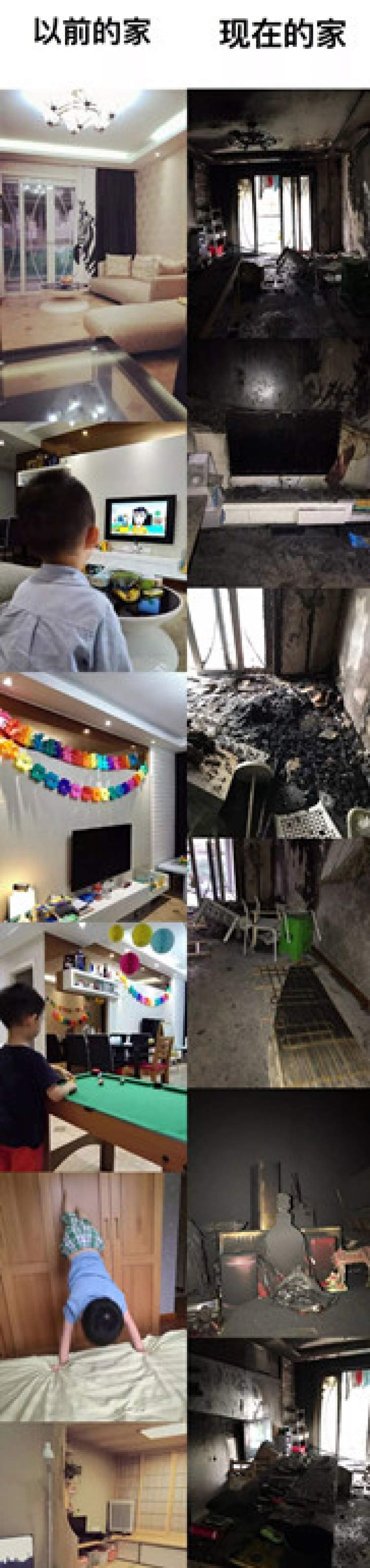 该条微博,同时附上了4组照片,一组是“(起火)以前的家”,装修看起来舒适温馨,一组是“现在的家”,家中所有一切几乎都被大火吞噬,只剩下焦黑的装修残骸。