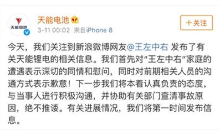 随后,天能电池集团有限公司(以下简称“天能电池”)通过官方微博发布消息,“对前期相关人员的沟通方式表示歉意”,并表示“下一步将本着认真负责的态度,与当事人进行积极沟通,并协助有关部门查清事故原因,绝不推诿”。