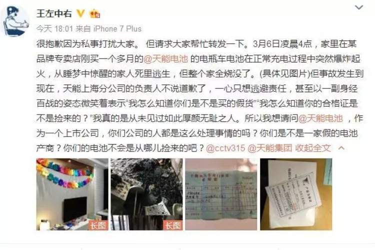 3月10日18:01,知名博主“王左中右”发了一条微博:“3月6日凌晨4点,家里在某品牌专卖店刚买一个多月的@天能电池的电瓶车电池在正常充电过程中突然爆炸起火,从睡梦中惊醒的家人死里逃生,但整个家全烧没了。”