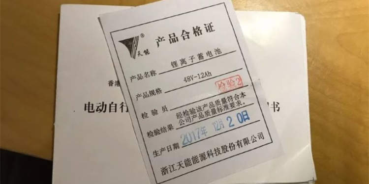 此外,还有一张“浙江天能能源科技股份有限公司的‘天能’牌锂离子蓄电池的产品合格证”。