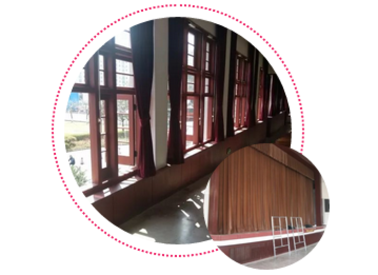 二楼保留着原来礼堂的格局,扭动手把、吱呀呀推开木门、登上几级台阶后,眼前变得开阔了。312个标号有些许脱落的木椅子、哑色红窗沿用着老插销、木框上还依稀看得出斑驳痕迹。