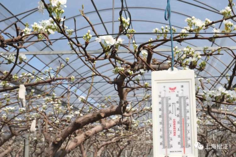 梨树喜温,生长需要较高温度,大棚内设置了多个温度计,随时观察梨树的生长条件。