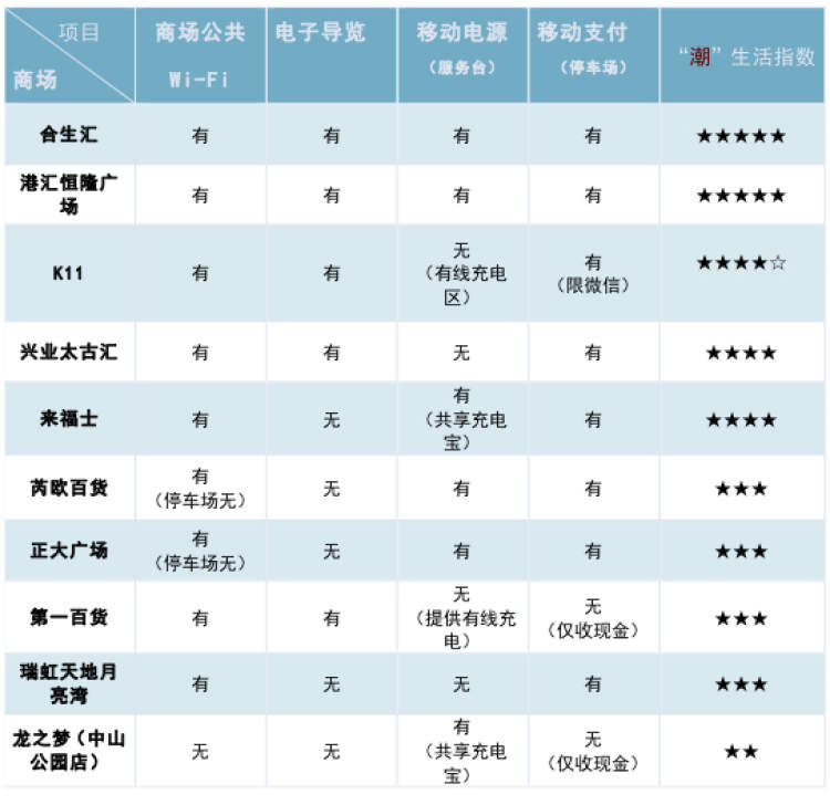 那么,沪上商场的“潮”指数到底如何呢?周到记者挑选了沪上10家深受年轻人喜爱的商场,对免费Wi-Fi、充电宝租借、智能导览以及电子支付进行了逐一测评。