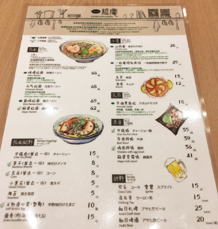 拍照满分,适合文艺小清新来凹造型,环境棒棒哒~一粒庵的菜单很简单,主食基本上只有四种拉面,拉面只有两种口味,北海道的味噌汤底和上海口味的汤底,配菜和小食倒是有更多可供选择的类型。