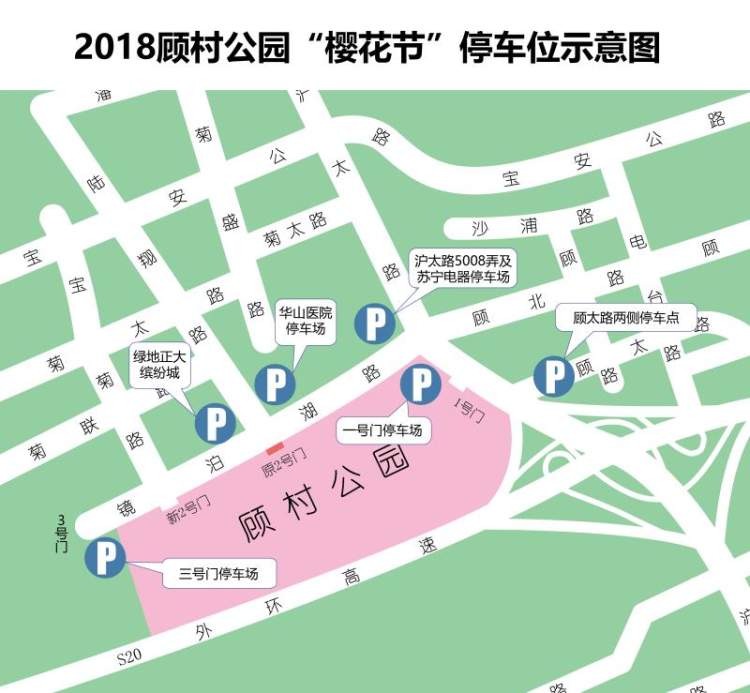 在宝山交警制作的公园周边停车示意图上,除了公园1号门、3号门两个停车场外,还包括绿地正大缤纷城停车场(靠近公园2号门)、华山医院北院停车场(靠近公园2号门)、沪太路5008弄及苏宁电器停车场,以及顾太路两侧停车点。整个公园周边停车位总计5400个。