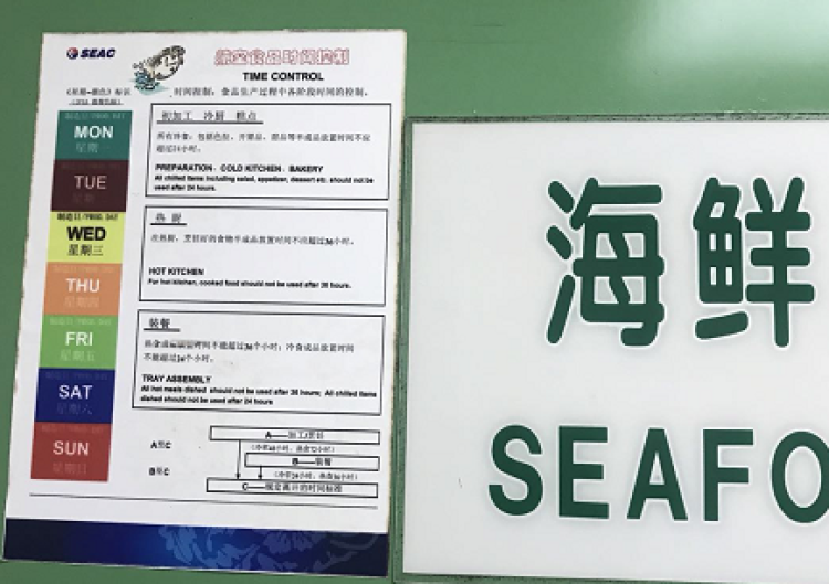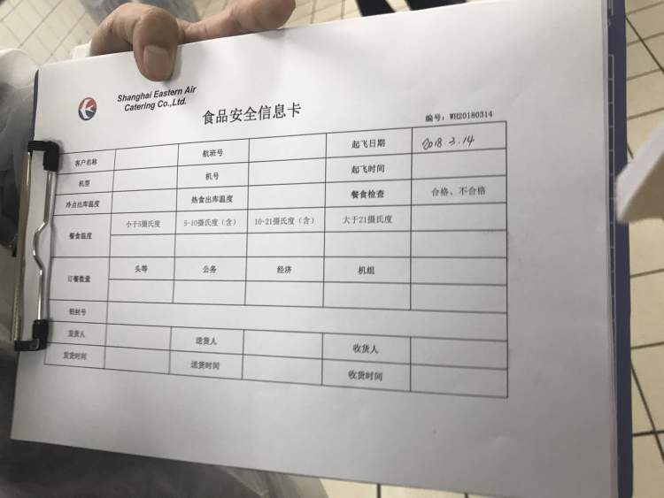 而在一批批“飞机餐”完成后统一装车时,都会有一张食品安全信息卡“陪同”着,上面明确记录了相应的航班号、起飞时间、订餐数量、出成品库的温度、餐车的温度等信息,以便于监管部门对两个质量控制期(即加工到预计起飞时间和出成品冷库到餐食正式被旅客食用两个阶段)进行追溯管理,同时也方便航空服务人员清晰地了解到餐食的准备过程,掌握供餐时间。