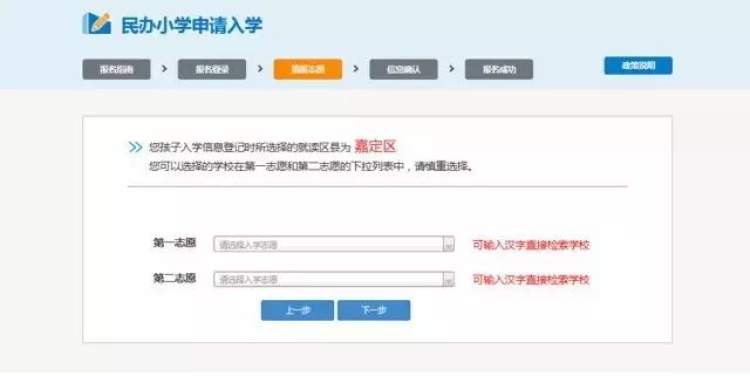 确认就读区县(入学信息登记时所选),然后在下拉列表中选择志愿学校,每个适龄儿童可以填报2所学校。