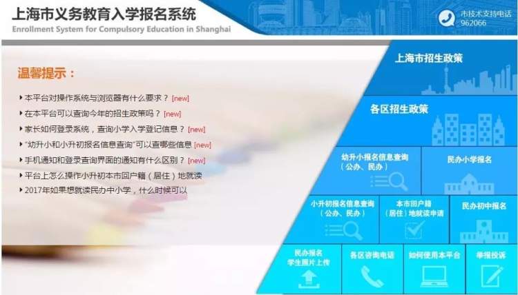 通过“入学报名系统”,适龄儿童、少年的家长可及时了解市教委公布的招生政策和政策问答、各区教育行政部门公布的义务教育阶段学校招生入学实施办法、划片招生方案等,进行网上报名,查询子女入学相关信息等。