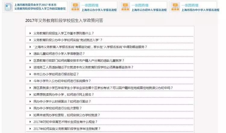 点击首页右侧“上海市招生政策”,可以快速查询到市教委公布的招生政策和招生政策问答。