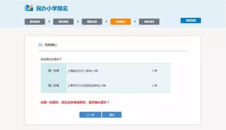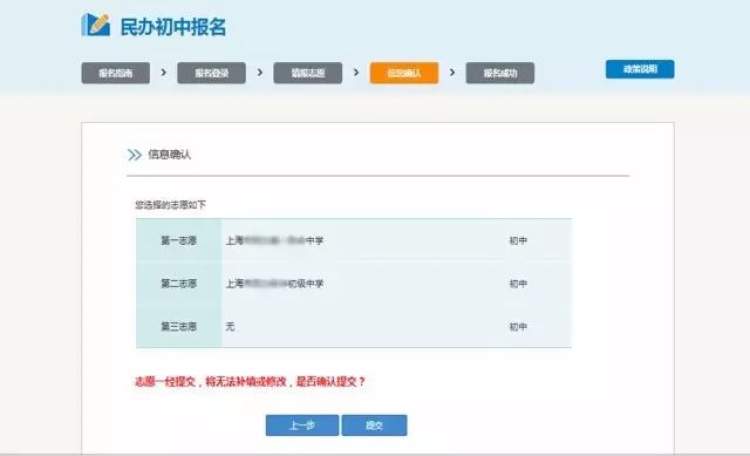 在该步骤,请确认是否是您在上一步中所选志愿学校,志愿一经提交无法修改,请慎重提交