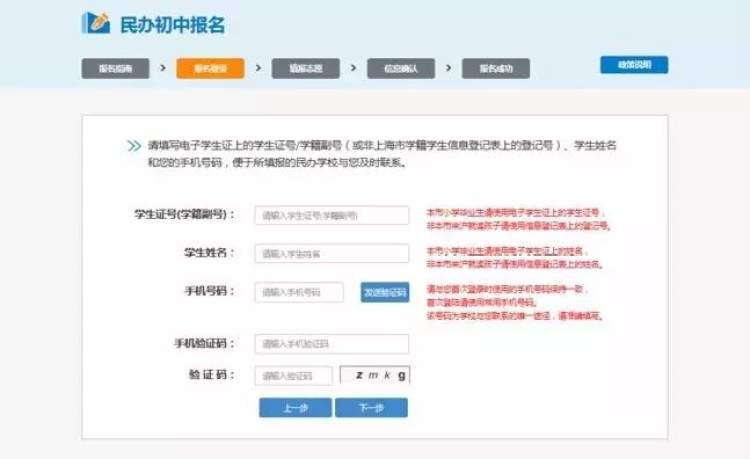 在该步骤,需填写学生证号(本市小学毕业生请使用电子学生证上的学生证号,非本市来沪就读孩子请使用信息登记表上的登记号。)、 学生姓名(本市小学毕业生请使用电子学生证上的姓名,非本市来沪就读孩子请使用信息登记表上的姓名。) 和手机号码(请与您首次登录时使用的手机号码保持一致,首次登录请使用常用手机号码。该号码为学校与您联系的唯一途径,请准确填写。)