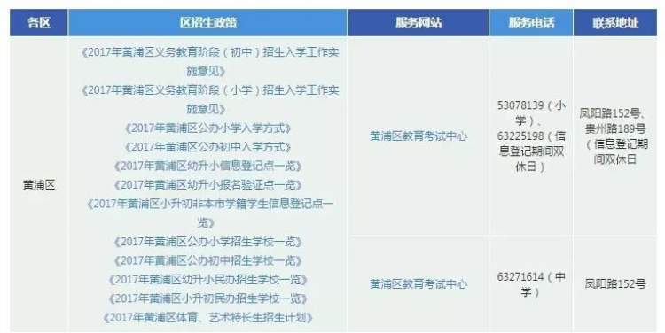 点击首页右侧“各区招生政策”,可以快速查询到各区教育行政部门公布的义务教育阶段学校招生入学实施办法、划片招生方案等(以黄浦区为例)。