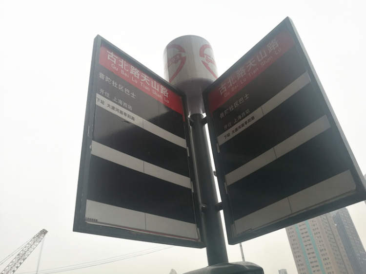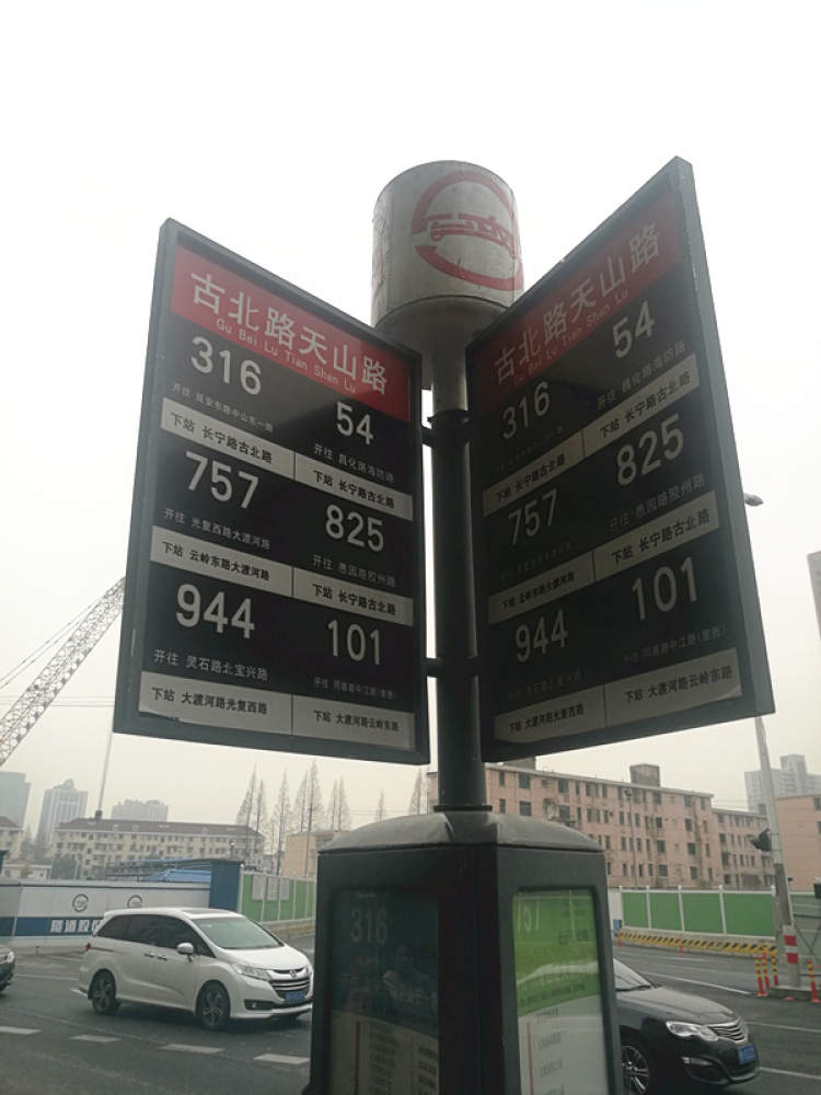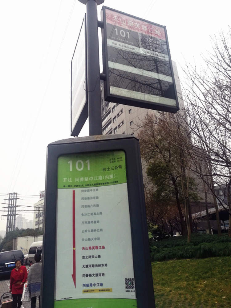 在古北路天山路站,这里没有电子屏,公交站牌上101路和普陀社区巴士分别有各自的站牌。