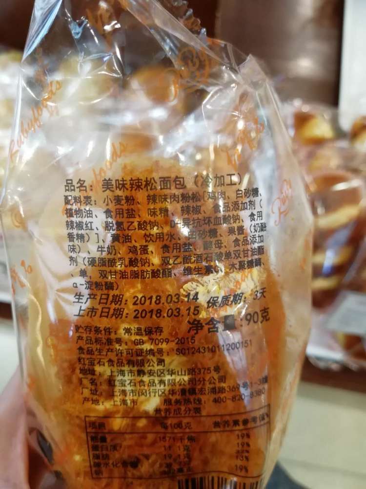 13日,周到君走访沪上多家面包店、卖场、便利店,发现肉粉松产品相当主流,而且名称五花八门。在长海路的红宝石面包店里,有一款零售价10元的“美味辣松面包”,配料表里写着“辣味肉粉松”。