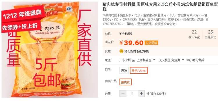 周到君看到,多家店铺售卖的“金丝肉松”5斤装价格仅在40多元,这些卖家往往在首页宣传图片上就写上了用于“寿司、面包、手抓饼”。其中,有一家做“猪肉松寿司批发”的,5斤装最低仅39.6元,每斤仅7.92元。卖家承认,这款肉松豌豆粉多、肉少,“建议商业使用,个人、家庭慎用或不用。”该店自称专业批发肉松,配送各地的面包房、寿司料理店、奶茶店、手抓饭饼店、章鱼小丸子店等。卖家表示,如果对肉松的品质有要求,可以选拍店内其他品种的肉松。