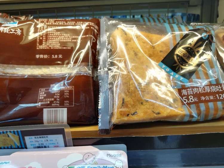 如今,许多便利店里也会销售面包。13日,周到君从数家连锁便利店里找到了两款“肉松排包面包”和“海苔肉松厚烧吐司”,其配料表标注的主要是面包的制作原料,肉松/海苔肉松作为一项也位列其中,但是肉松/海苔肉松的成分却没有进一步介绍。