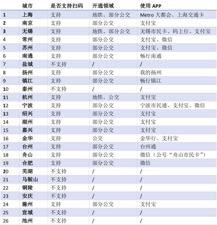 上海的“Metro大都会”(地铁)和“上海交通卡”(公交),无锡的“码上行”(地铁)和“无锡市民卡”(公交),南通的“畅行南通”,宁波的“宁波市民通”,金华的“金华行”,舟山的微信公众号“舟山市民卡”。