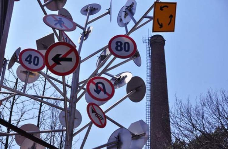 限速、改道、电子监控等所谓的文明符号将人们自己牢牢地圈禁于其中。周到君在揉成一团被丢弃于角落里的公路标识前驻足,带有些许茫然与震惊:“成都”在哪里?方向在哪里?寂静角落里的喧哗躁动,令人难以忽略。