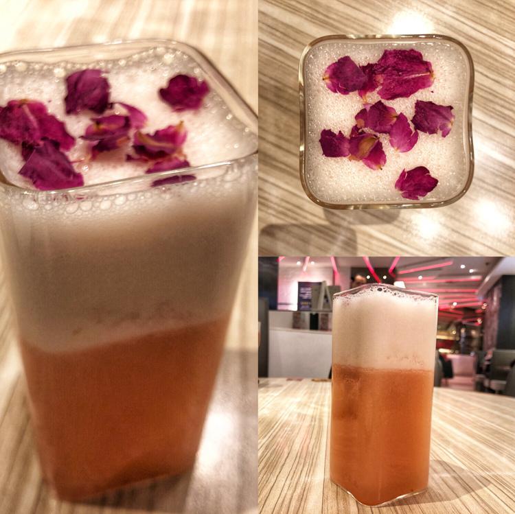 饮料是淡粉色,用方形容器盛着,上层是厚厚的雪霜(非奶盖),杯口点缀着玫瑰花瓣,颜值满分!