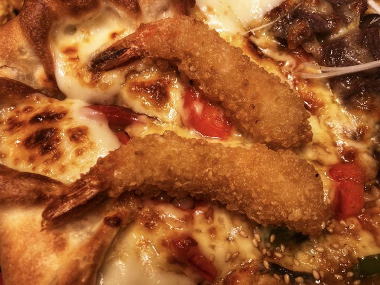 被两只天妇罗大虾霸占的披萨。天妇罗炸得酥酥脆脆的,配上彩椒的独特滋味,美味!