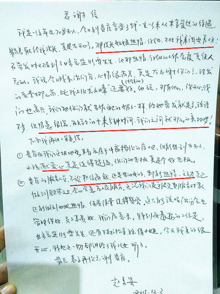 有位70多岁的老人享受了免费理发这一服务后,特地写了一封感谢信,信中有几句话说得很暖:店内员工的热情体贴,不比她的闺女差。