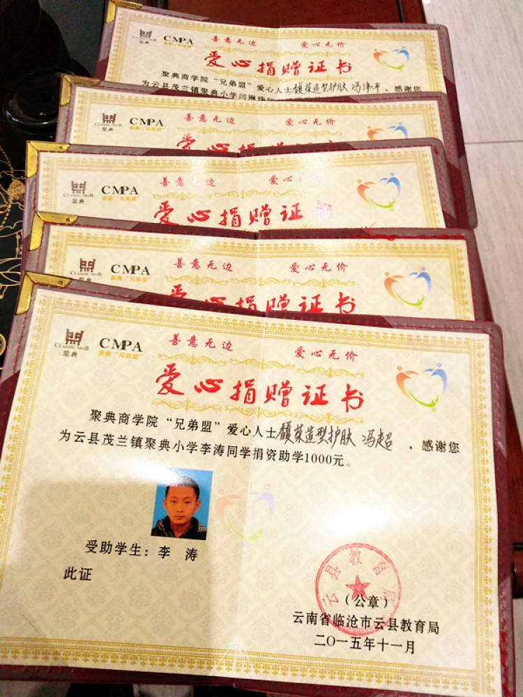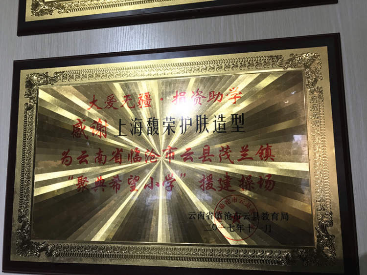 这两块牌子吸引了小哥的注意,问其背后的故事,老板冯为平称,“馥荣护肤造型”还一直坚持向贫困山区捐赠希望小学,目前为止,已经向云南省临沧市云县捐赠了2所。当然除了老板外,这其中也有员工们的爱心筹款。