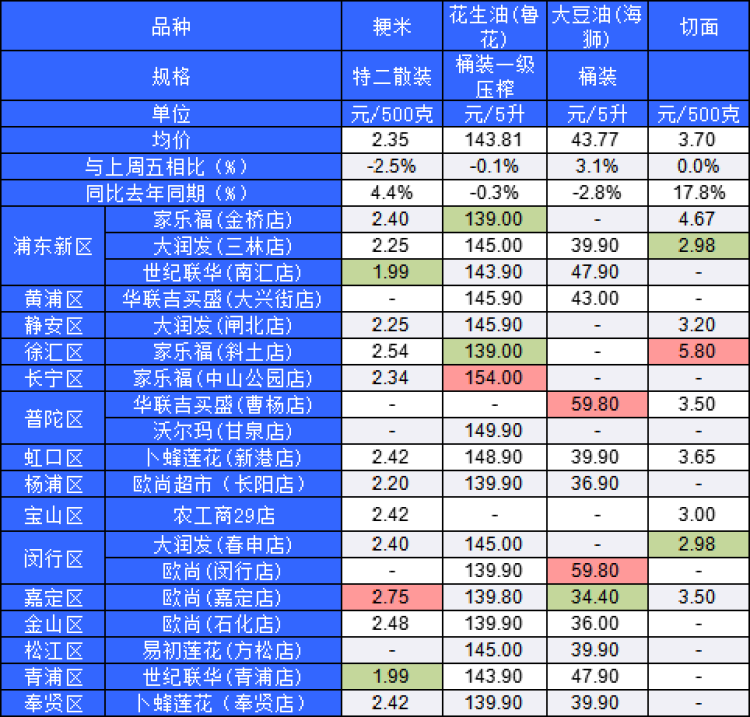 ■粉底标注代表该粮油品种在上述农贸市场或超市的最高价;绿底标注代表该粮油品种在上述农贸市场或超市的最低价