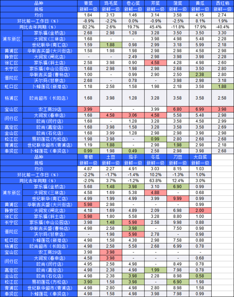 ■粉底标注代表该蔬菜品种在上述农贸市场或超市的最高价;绿底标注代表该蔬菜品种在上述农贸市场或超市的最低价