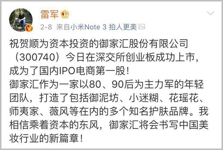 2018年御家汇登陆创业板那天,雷军还特地发了条微博来表示祝贺。