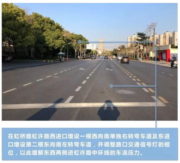 而在虹桥路虹许路路口,交警部门增设了一根东向南左转弯车道,使得该路口东向南转弯车道增加为两根,并调整路口交通信号灯的放行时间,以此缓解东西两侧转弯进虹许路的车流压力。