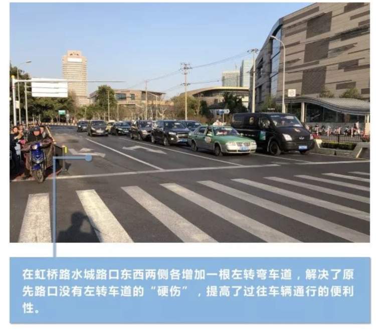 “以前要从虹桥路往水城路方向需要直走再掉头,现在至少节省了十分钟。”一位驾驶员告诉记者,这得益于交警部门在虹桥路水城路路口东西两侧各新增的一根左转弯车道。