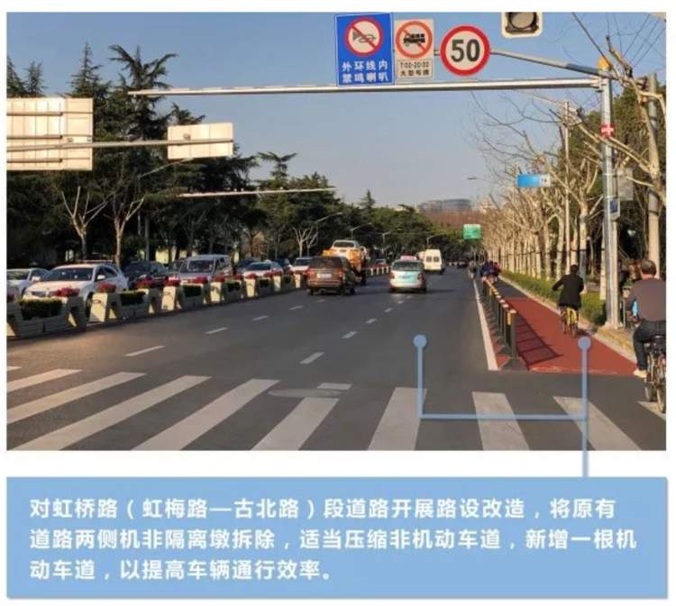 近日,虹桥路虹梅路至虹桥路古北路路段,道路两侧的机非隔离墩已经被拆除,取而代之的是机非隔离栏。新设的隔离栏将非机动车车道空间压缩,机动车道路增加了一根车道,使得原先的双向五车道增加到了现在的双向七车道。