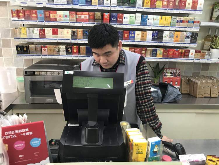 正在收银台前忙碌的吴建国