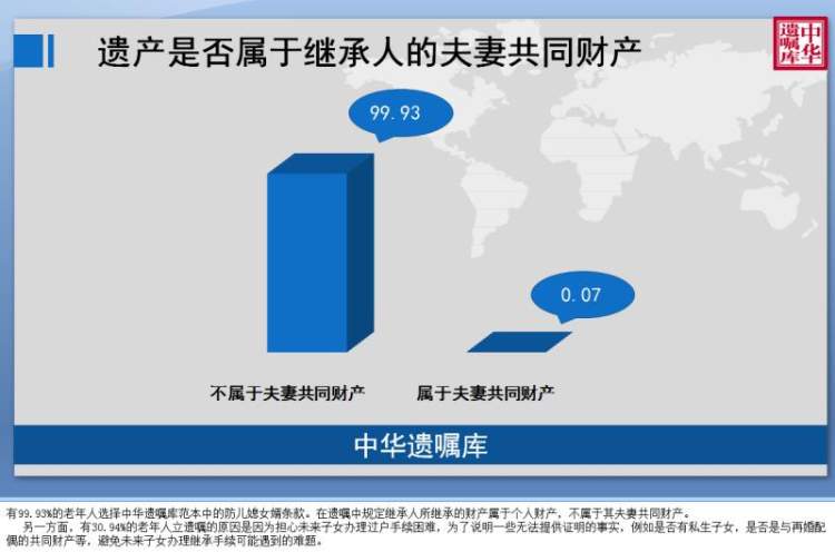 白皮书显示,有99.93%的老年人选择中华遗嘱库范本中的防儿媳女婿条款。在遗嘱中规定继承人所继承的财产属于个人财产,不属于其夫妻共同财产。