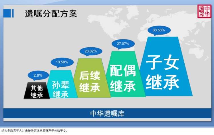 数据显示,继承人以立遗嘱人的子女、配偶、孙辈为主。其中子女直接继承的为33.53%,配偶互相继承后由子女继承的比例是27.07%,直接给孙辈的比例为13.58%,先给子女后给孙辈的比例为23.02%。绝大多数老年人并未按法定继承将财产平分给子女。