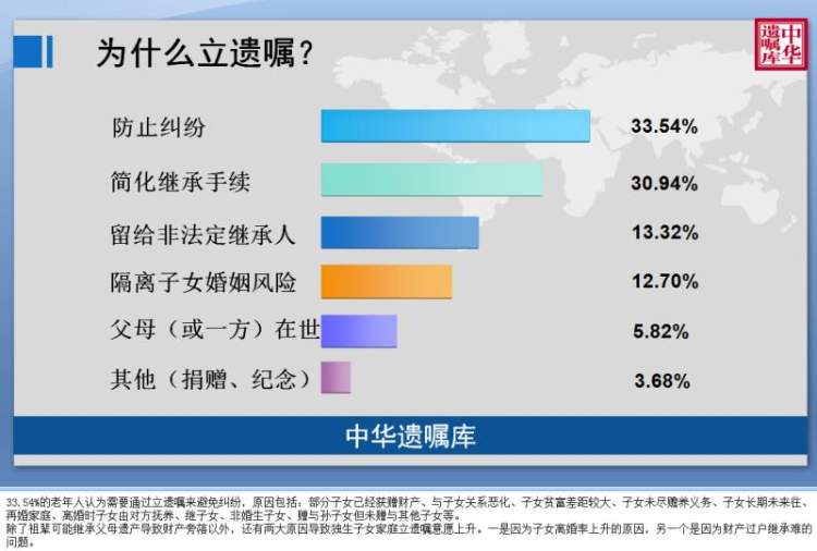 另一方面,有30.94%的老年人立遗嘱的原因是因为担心未来子女办理过户手续困难,为了说明一些无法提供证明的事实,例如是否有私生子女,是否是与再婚配偶的共同财产等,避免未来子女办理继承手续可能遇到的难题。